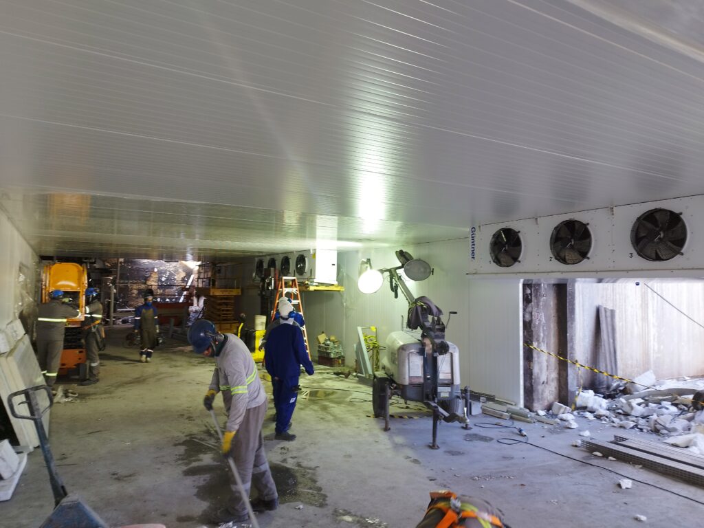 - Mobilização imediata: no mesmo dia do sinistro, a Kalter mobilizou uma equipe para o local. Nossos técnicos iniciaram o projeto detalhado de refrigeração, trabalhando incansavelmente para reestruturar o sistema de frio do frigorífico.